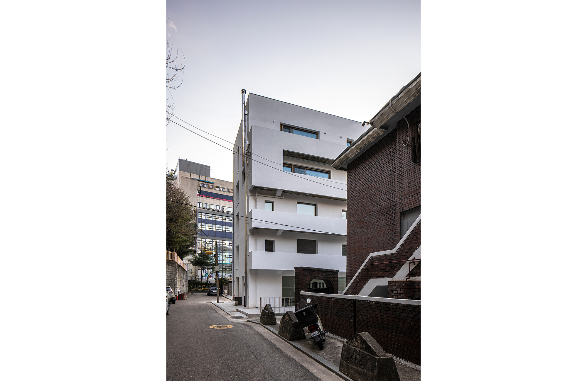 최상층인 5층은 이전 건축주의 집으로 사용되었으며 4층은 임대 주거공간, 3층부터 지하 1층까 지의 공간은 다양한 용도로 세를 주어 사용하였다. 우리는 클라이언트에게 최적화된 공간을 만 들기 위해 구조를 제외한 기존 건축물의 모든 형태를 지우고 빈 도화지에서 시작하고자 하였다. 이렇게 빈 공간에서 우리는 클라이언트의 루틴을 쫓아 공간을 그려나갔다. 그가 일어나 잠드는 순간까지의 일과는 공간의 동선이 되었다. 근린생활시설인 건축물의 특징상 건물을 이용하는 사 람이 클라이언트의 가족들뿐이 아니라는 점에서 우리는 가족들의 동선을 분리하여 온전하게 확 보해주는 것이 중요하다고 보았다. 이에 주택의 현관은 일반적으로 생활하는 공간에 가까이 있 는 것과 달리 우리는 현관을 1층으로 배치하였다.