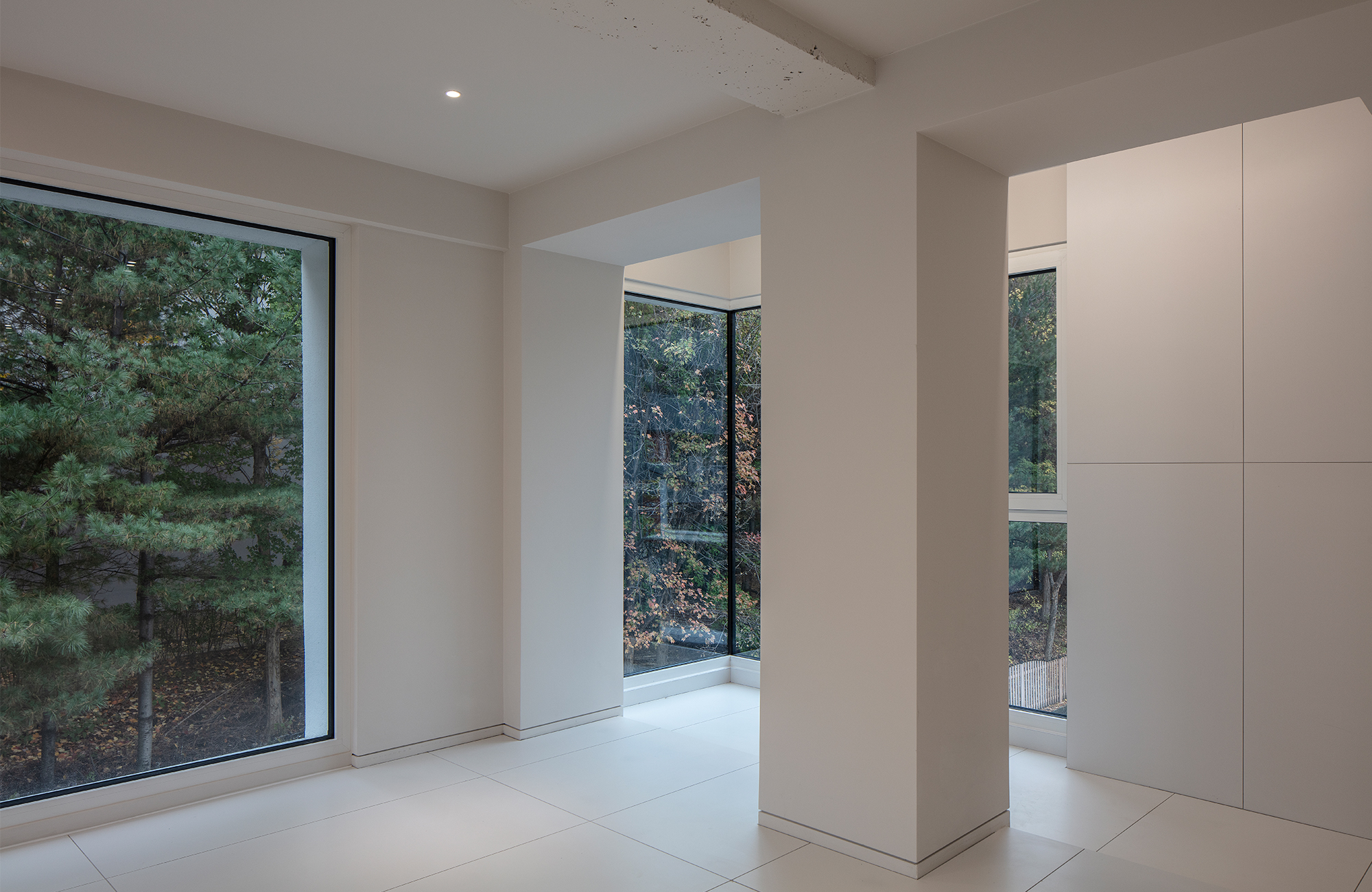 1층의 현관에서 올라오면 나오는 주거층인 4, 5층은 크게 공동 생활공간과 각 구성원의 개인 생 활공간으로 프로그램을 분리해주었다. 다세대 주택들이 밀집한 사이트의 특성상 가족들의 프라 이버시를 확보함과 동시에 개방감을 주기 위해, 건축물의 외형을 기준으로 창을 배치하는 일반 적인 방식과 달리 철저하게 내부의 생활 공간을 중심으로 창을 뚫어주었다. 이에 따라 트인 야 외의 풍경을 조망할 수 있는 배면은 자연스럽게 거실이 되었다. 사계절에 따라 각 풍경을 제한 없이 조망할 수 있도록 TV 등의 고정형 가전은 이동형으로 계획하였으며 이에 따라 주택의 거 실은 모든 면이 트여있는 공간이 되었다. 남향에 해당하는 면을 온전히 들이고자 코너 창호를 활용하였으며, 이 공간을 클라이언트의 반려 식물에게 내주었다. 물을 주기 위해 화분을 끌고 화 장실로 가던 기존의 불편함 경험을 해소하고자 이곳은 물을 쓸 수 있는 공간으로 계획하였다. 거실을 지나 나오는 주택의 주방은 클라이언트의 요리 방식에 맞추어 2개의 보조 주방과 메인 주방 및 다이닝 룸으로 분리되어 있다. 동선에 따른 효율적인 주방의 배치를 위해 보조 주방은 외부로 돌출된 매스를 갖게 되었으며, 이는 테라스가 나열된 건축물의 외형에서 변주를 주는 요소가 되었다.