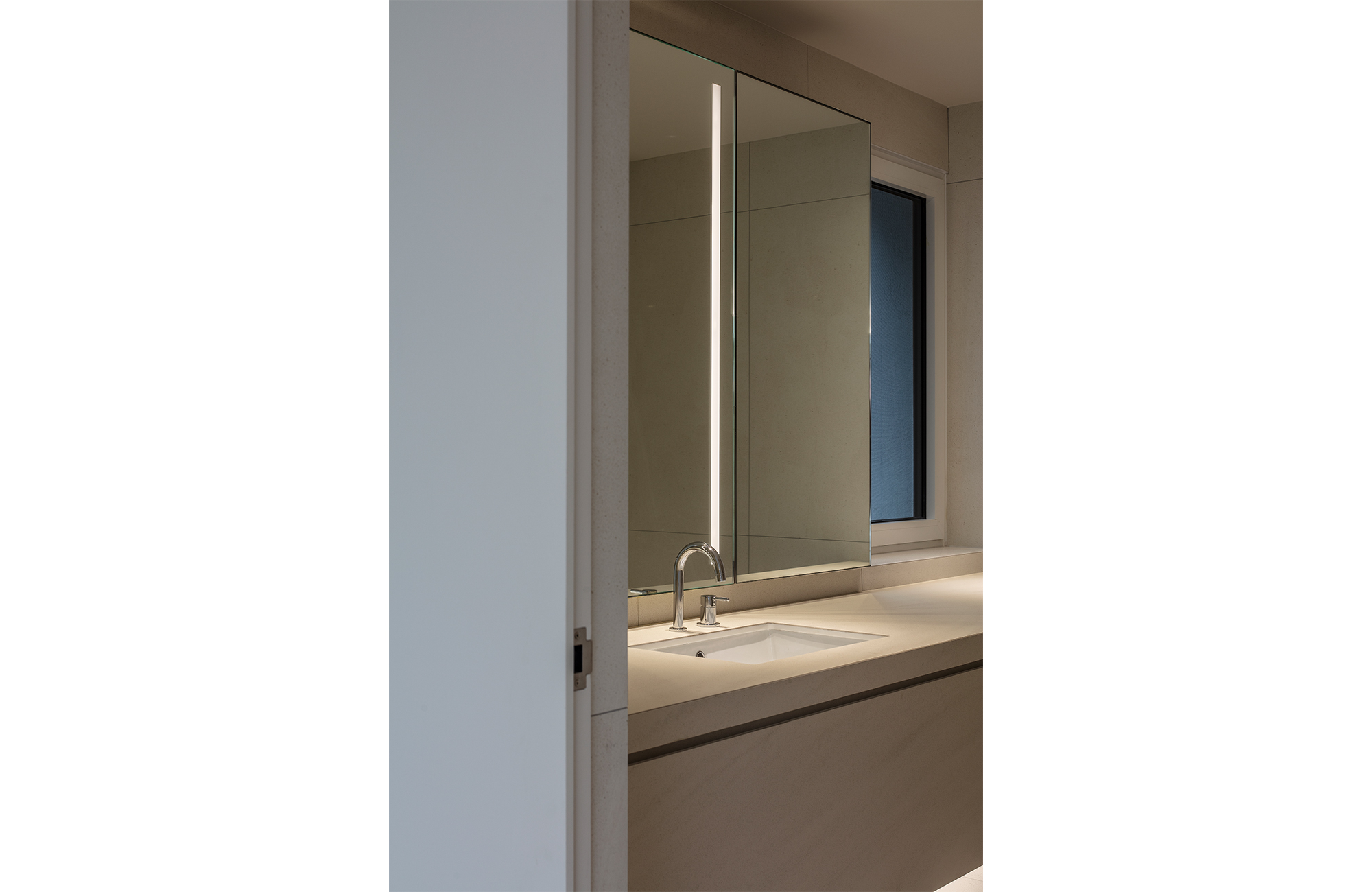 이렇게 가족들이 함께 사용하는 공간인 4층을 지나 올라가면 각 침실이 위치하고 있는 5층이 있다. 우리는 두개의 공간이 분리되는 시점인 5층으로 향하는 계단의 첫 단에서부터 따뜻한 톤 의 우드 플로링이 가족들을 맞이할 수 있도록 하였다. 5층은 각 자녀의 침실과 욕실, 마스터 룸 과 부부의 드레스룸, 욕실로 구성되어 있다. 여기서도 일반적인 방식에서 벗어나 클라이언트의 라이프스타일에 따른 공간의 구성이 돋보이는데, 흔히 보조 주방이나 다용도실에 있는 세탁실을 각 침실을 이어주는 복도로 배치한 부분이 그것이다.