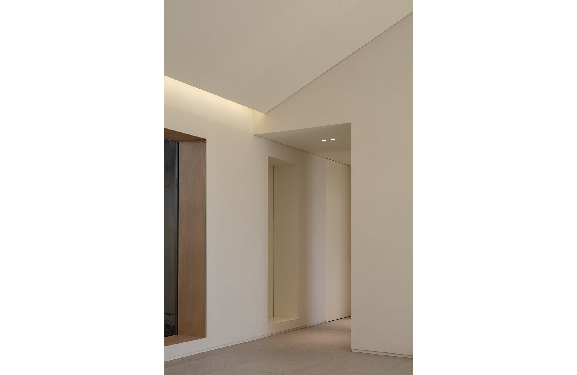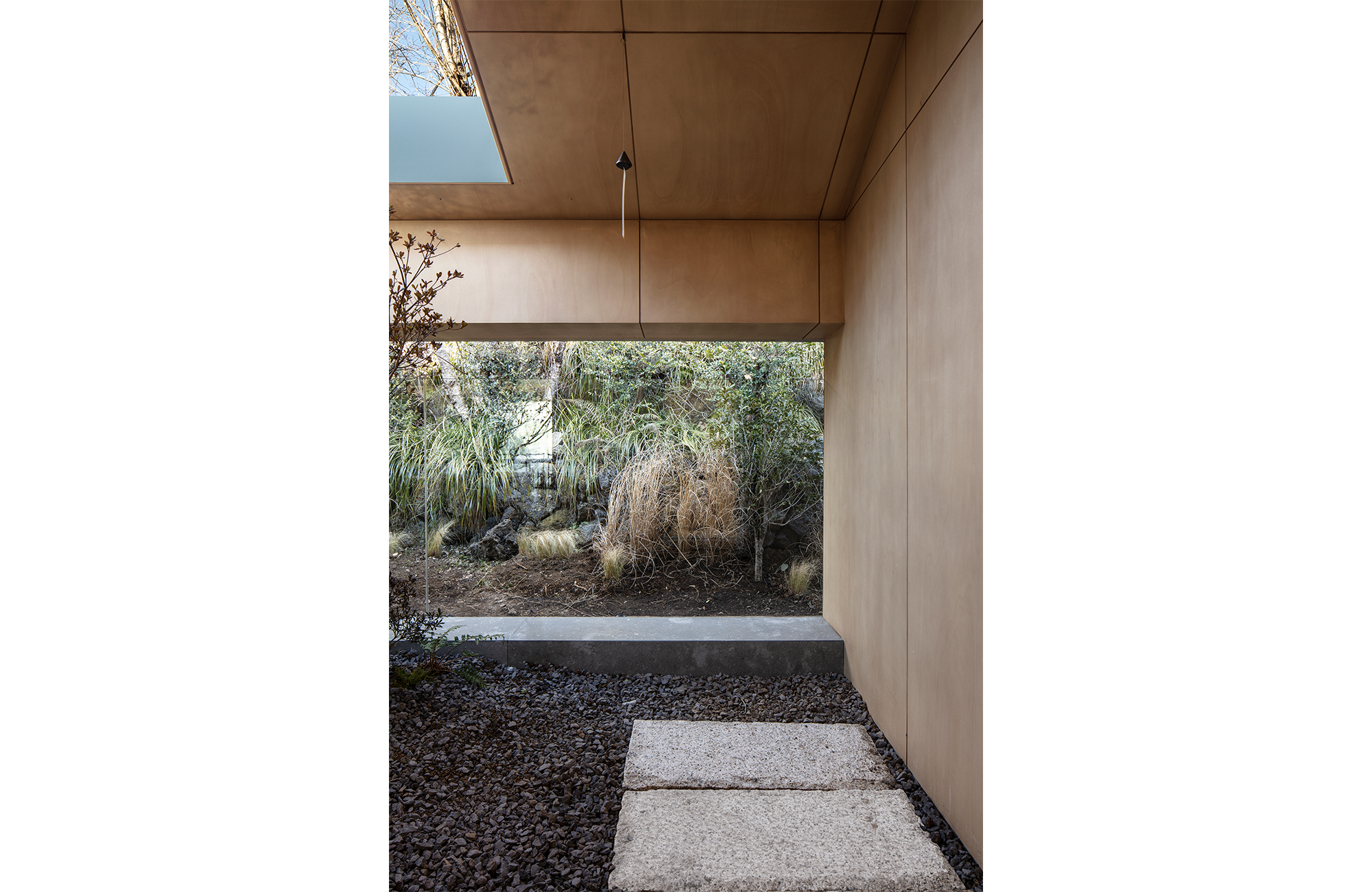 큰 현관문을 열고 들어오면 벽면의 프레임 너머로 뒤뜰의 식재를 먼저 마주하게 된다. 진입로의 긴 통행로는 낯선 공간에 대한 기대감과 집의 아늑함을 동시에 느끼게 해준다, 길게 선 복도의 벽면은 변주된 프레임이 나열되어 있다. 프레임 너머 속 이 공간은 프라이빗 정원의 새로 조성된 조경과 오랫동안 자리하던 뒤뜰의 식재들이 중첩되어 마치 작품처럼 내부로 유입된다. 정원에 들어서면 정돈된 실내와 달리 자연과 닮아있는 우드톤의 공간이 있다. 이 공간은 툇마루 같은 실내의 공간과 실외의 뒤뜰로 나누어진다. 프라이빗 정원의 오픈된 천창과 측면의 틈을 통해 유입되는 바람, 비, 눈 등 정제되지 않은 자연을 그대로 마주할 수 있도록 한 것이다. 마치 툇마루에 앉아 자연과 마주하며 마음을 정제할 수 있는 작은 공간을 마련해주고 싶었다.