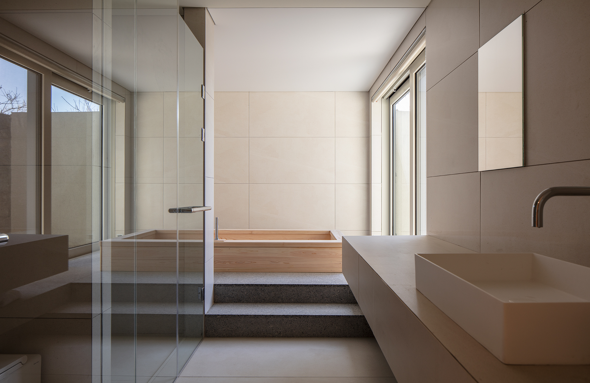 복도의 끝은 거실의 박공을 닮은 룸이 마련되어있다. 개인이 머무는 공간의 수납은 최소화 하고 대신 여행의 캐리어를 대로 담을 수 있는 선반을 마련해주었다. 열거 해놓은 물건을 그대로 담아갈 수 있도록. 자신의 물건이 익숙한 공간의 일부가 될 수 있도록. 룸에 연결된 욕실 안쪽에는 욕실과 연장되어 있는 별도의 프라이빗한 외부 뜰이 위치해있다. 히노끼 욕조의 시간을 즐기며 욕조에서만 볼 수 있는 조경과 함께 욕실에서의 시간을 존중 받을 수 있도록 계획한 것이다.