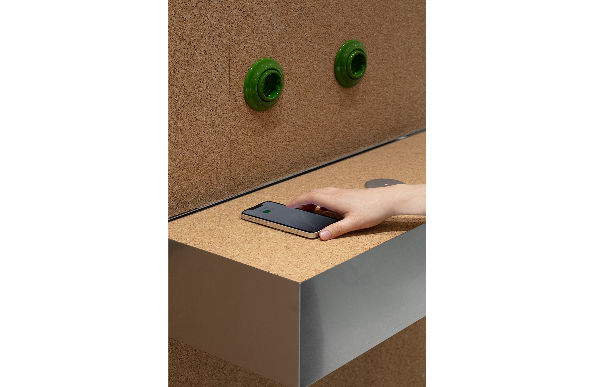 SeSAC 송파 캠퍼스는 정방형에 가까운 19m x 17m 구조로, 출입구가 위치한 전면을 기준으로 강의실(Private), 사무 및 상담실(Public & Private), 라운지(Public)의 세 영역으로 나뉘어 구성된다. 이 중 중앙에 배치된 사무실과 회의실 등은 하나의 매스 형태로 공간 속에 돌출되어 배치되었고, 구조 자체가 디자인의 중요한 요소로 작용하도록 유도했다. 이 매스들은 흡음 효과와 친환경성을 고려해 코르크로 마감했고, 마감재는 단지 시각적 역할을 넘어서 기능적 의미를 부여받는다. 예컨대 벽면에는 핸드폰 무선 충전 선반, 이동형 선반, 콘센트 등 사용자와 상호작용하는 기능들을 심어, 벽체 자체가 ‘학생과 반응하는 인터페이스’가 되도록 했다.